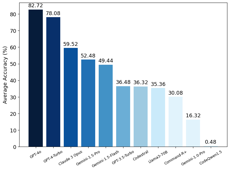 Figure 3. Comparing the average accuracy across all context lengths and target depth for each model, excluding 16K tokens results. GPT-4o has ~2x higher accuracy than 3.5, Llama3-70B & Command-R+