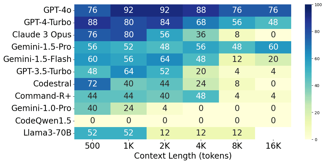 To give context, 16K tokens are around 25 pages long. The models are challenged to find a single syntactic bug, which could be as small as a missing parenthesis, within 25 pages of code! This benchmark poses quite a challenge to many of the models.