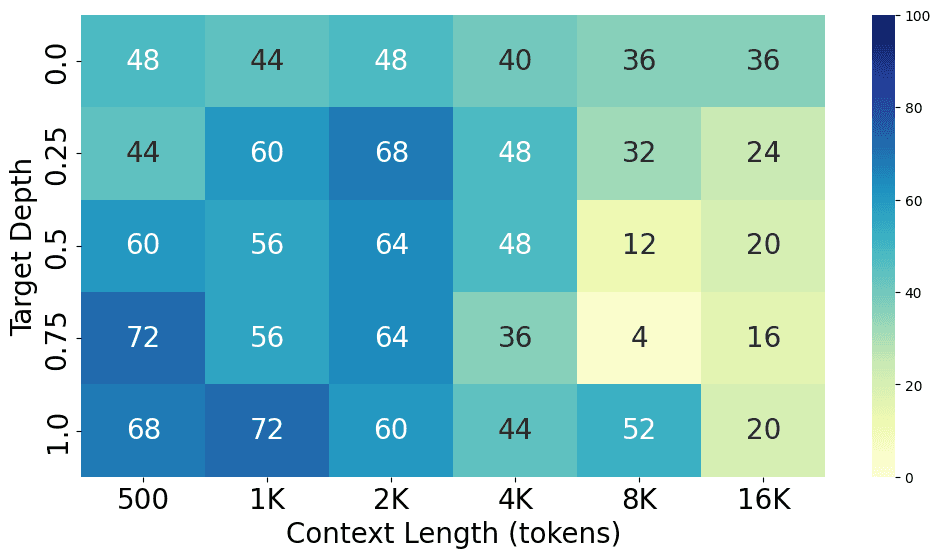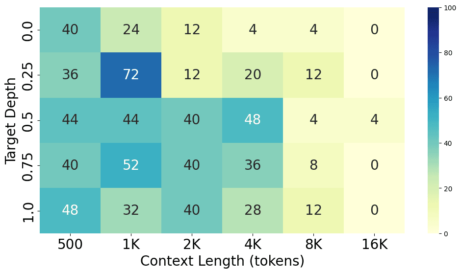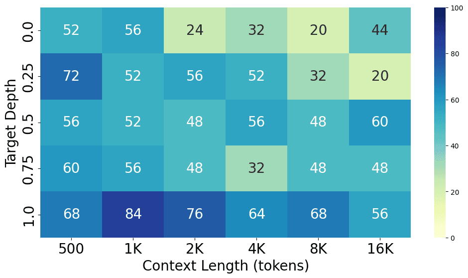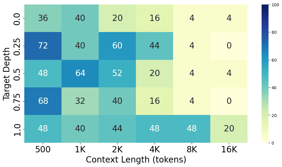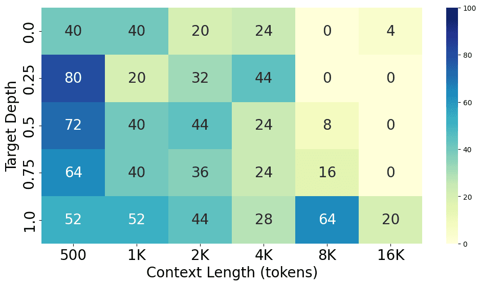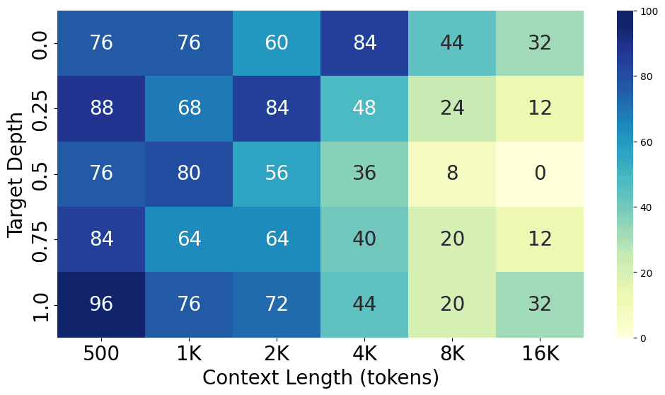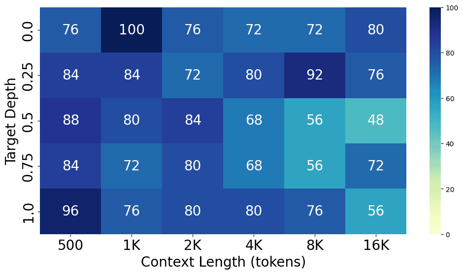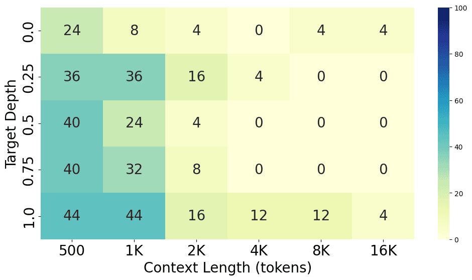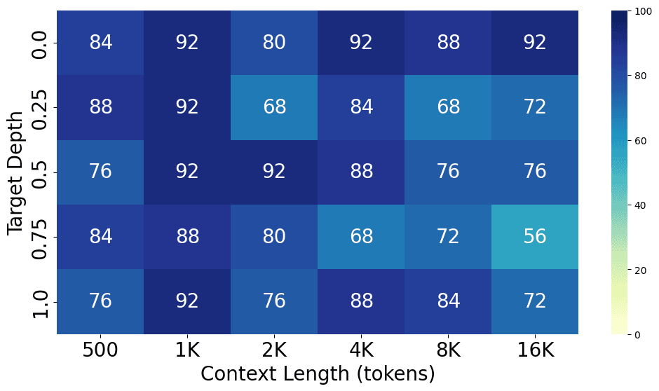Each model was run on context lengths ranging from 500 tokens to 16K tokens and target depths ranging from 0% to 100%. We ran each experiment 25 times, and the average accuracy is shown in the following charts.