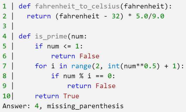 Figure 1. Sample source code with a syntactic bug, the LLM is tasked with retrieving both the line number (e.g. Line 4) and the type of the bug (e.g. Missing Parenthesis) that occurs in the input code. We place the bug at various depths within the source code to evaluate the LLM's ability to retrieve the bug accurately.