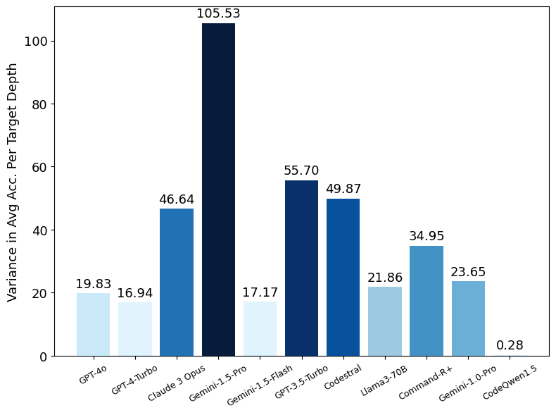 Figure 4. Comparing the variance in average accuracy per target depth for each model, a higher variance indicates that the model is more sensitive to the placement of the bug within the source code. Claude 3 Opus, 3.5 Turbo and Command-R+ are the most sensitive.